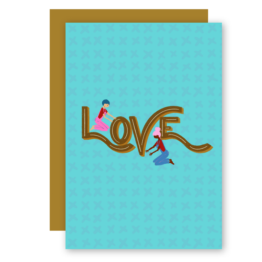 Show your care with this whimsical card illustrated by Julia Barry. On a blue background, two people reach out around the hand-illustrated word "Love."
