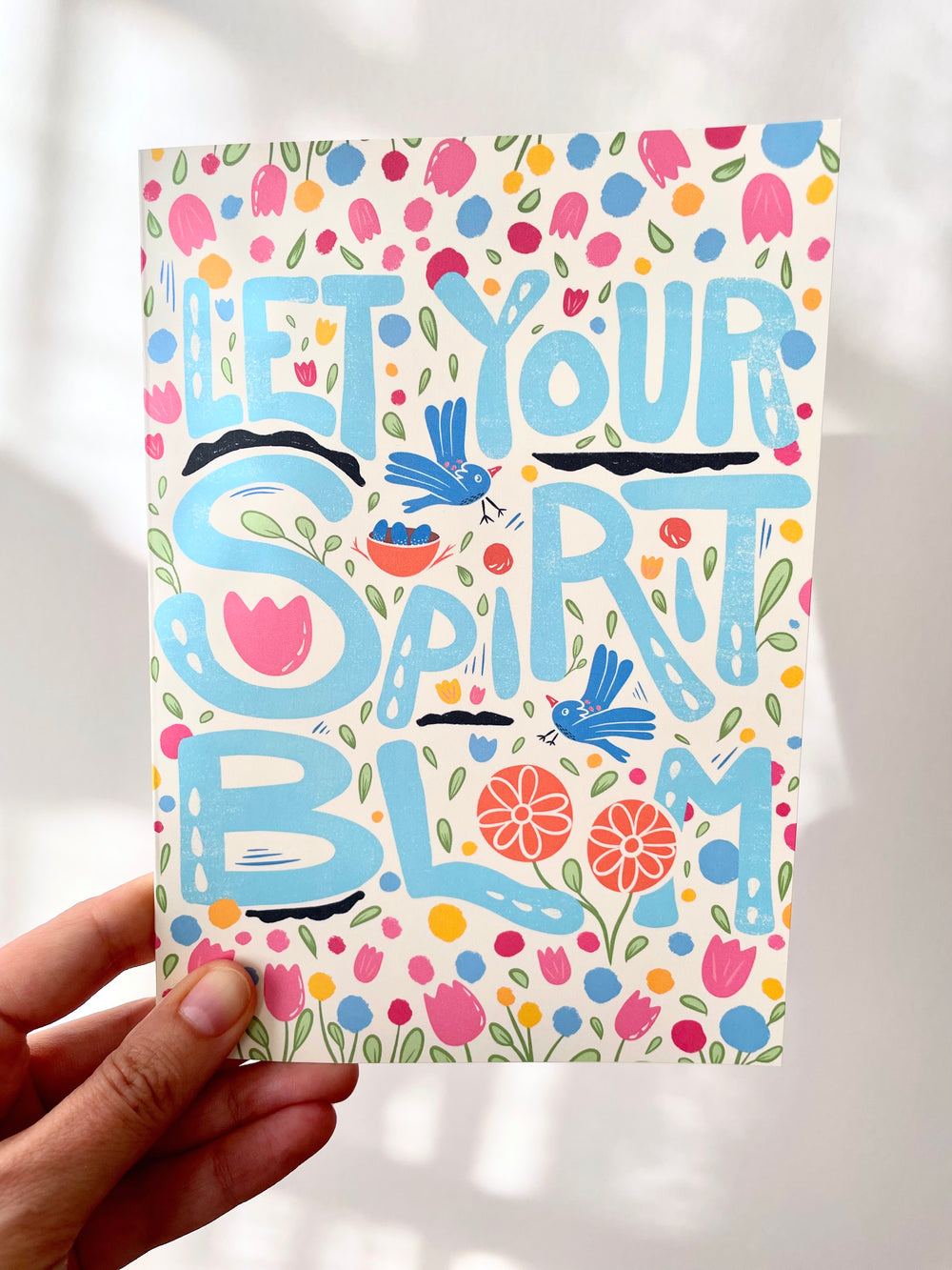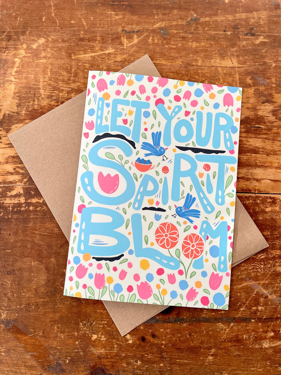 This beautiful card will bring colorful levity and inspiration to anyone you send it to! The front features the hand-lettered phrase "Let Your Spirit Bloom" in blue letters, with hand-drawn whimsical art of flying birds, birds' nest, tulips, and green leaves dancing around. It's printed on recycled or FSC-certified paper with eco-inks and includes a recycled envelope to be good to the Earth, too. Plus, your order plants a tree + 10% of profits go to local farms, wildlife & environmental justice organizations!