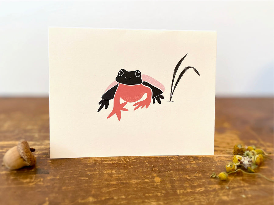 Crouching Nordic Frog w. Reed - Recycled Hand-Drawn Eco Greeting Card + Recycled Envelope, Blank inside (Words of Love)