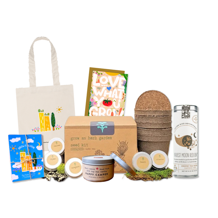 Tote bag with adorable Green Cities pattern; Hand-lettered "Love What You Grow" greeting card with vegetable art + recycled envelope; Pocket mindfulness journal with meditative art, coloring pages & prompts; "Harvest Moon" Caffeinated Chai Tea (caffeine-free, red chai spices with African red tea, vanilla bean & citrus); "Happy Camper" Soy Crackling Wick Candle (Sandalwood + Vanilla); and All-in-one Herb Garden Growing Kit with 5 biodegradable peat planters, a soil pod (2 qts), and 5 types of organic non-GMO heirloom herb seeds: Basil, Oregano, Thyme, Chives, and Cilantro.