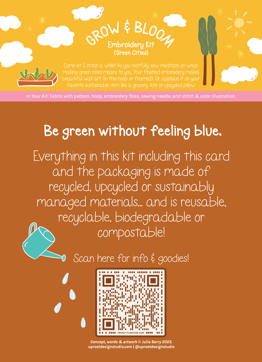 It can be hard to slow down and live with more intention, but purposely setting aside time to rest and take care of ourselves and others is one way in. With our adorable "Love What You Grow" Green Cities embroidery, we invite you to relax and think about what building green cities means to you. In this embroidery kit, we provide you with everything you need to get started, so you can dive in and start relishing your crafty downtime.