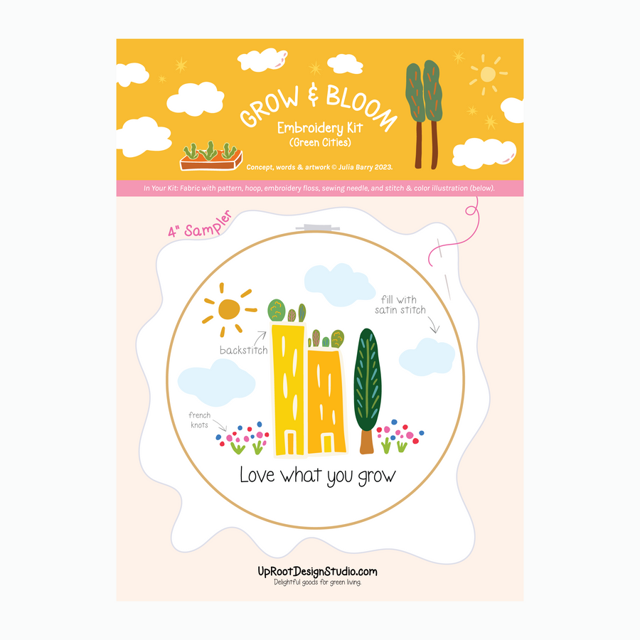 "Love What You Grow" Eco-Embroidery Kit w. City Buildings, Plants, Trees & Flowers 4" Sampler (Joyful Threads Grow & Bloom)