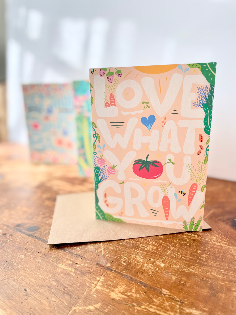 "Love What You Grow" Eco Recycled Greeting Card w. Hand-Drawn Art w. Vegetables, Fruit, Bees & Sun + Recycled Envelope, Blank inside (Grow & Bloom)