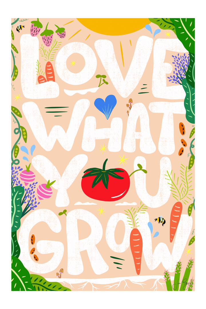 This beautiful card will bring colorful levity and inspiration to anyone you send it to! The front features the hand-lettered phrase "Love What You Grow," with hand-drawn whimsical art of the sun, fruits & vegetables, grape hyacinth flowers, water droplets, & bees surrounding. Your card is printed on recycled or FSC-certified paper with eco-inks and includes a recycled envelope to be good to the Earth, too. Plus, your order plants a tree + 10% of profits go to local farms, wildlife & environmental justice organizations!