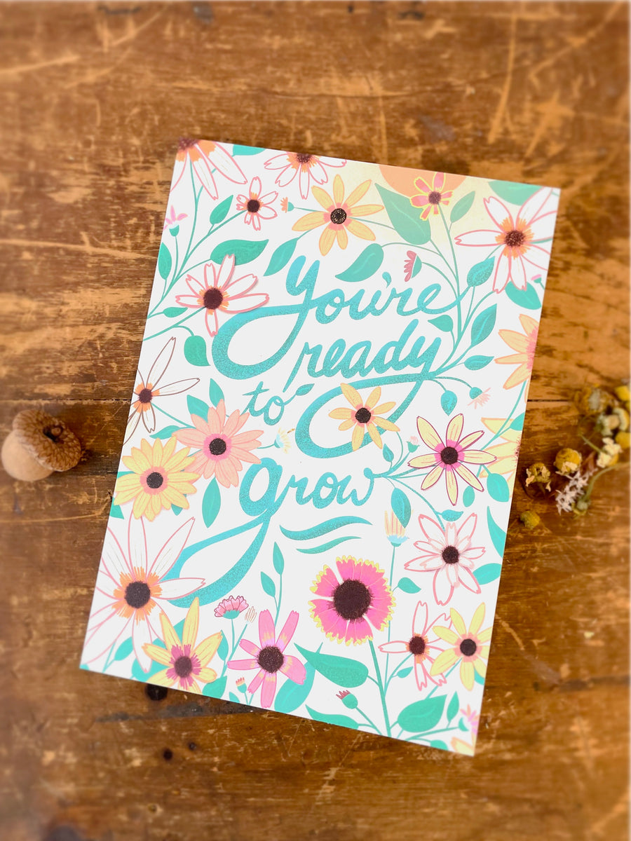 "You're Ready to Grow" Hand-Lettered w. Gaillardia Flowers - Recycled Hand-Drawn Eco Greeting Card + Recycled Envelope, Blank inside (Grow & Bloom)