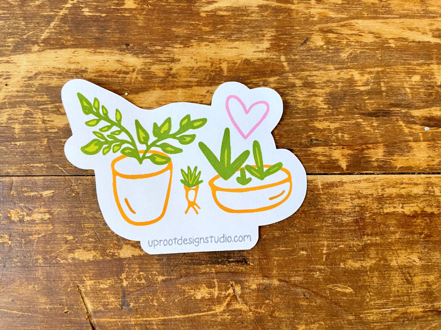 This adorable 3-4" sticker features a whimsical row of hand-drawn houseplants in pots, printed on curbside recyclable paper. Sold individually.