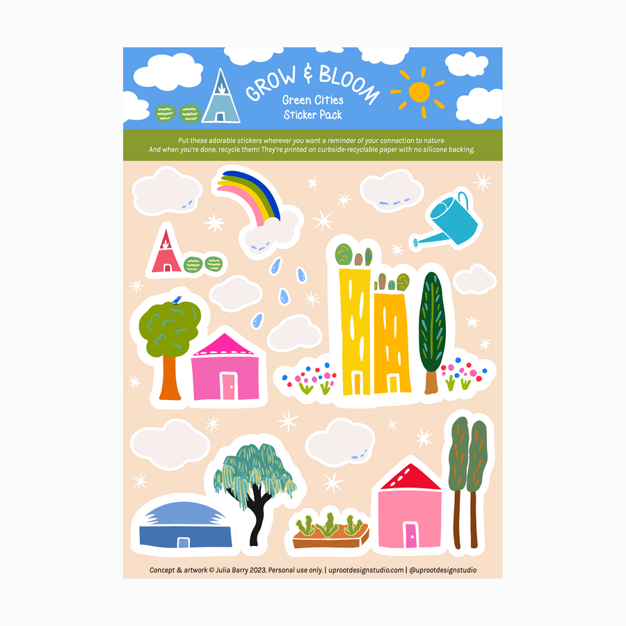 Adorable "Green Cities" Sticker Sheet of Eco Stickers w. Houses, Flowers, Trees, Clouds & Rooftop Gardens (Grow & Bloom)